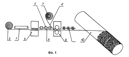 Als Zusammenfassung der angebotenen technischen Lösung gilt, dass das Werkstück in Form des ungebrochenen Stachel- und Schneidbands auf die Trommelaufgewickelt wird und diese Trommel zusammen mit den Klammern formiert die Bahn; gerade diese Umstände verleihen dem angebotenen Verfahren die aufgezählten und die sonstigen Vorteile. Die Verwendung der einzelnen technologischen Operationen, der konstruktiven Elemente oder der Anlagenknoten aus der Ganzheit der angekündigten beschränkt natürlich das Spektrum der Vorteile, die oben aufgezählt sind und kann als neue technische Lösung in diesem Kenntnisbereich nicht betrachtet werden, weil die anderen Verfahren, die dem beschriebenen ähnlich sind, werden kein schöpferisches Herangehen von den Konstrukteuren und den Ingenieuren brauchen und werden als Resultate deren schöpferischen Tätigkeit oder neue Objekte des geistigen Eigentums, was laut der Gesetzgebung die Schutzdokumente erfordert, nicht gelten können.