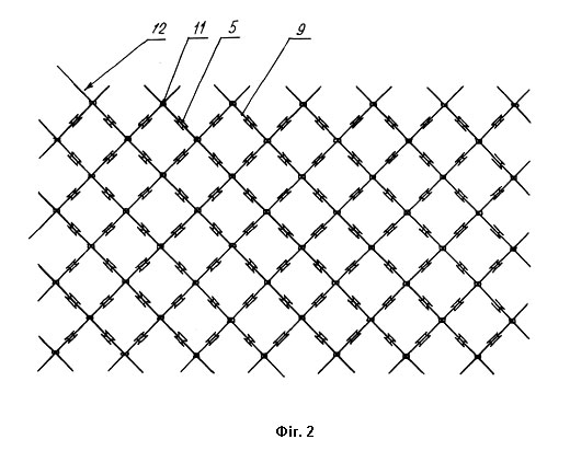Dieser Mangel wurde in dem bekannten Herstellungsverfahren der Netzbahn aus dem Stachel- und Schneidband beseitigt und zwar besteht es in der vorherigen Herstellung der geradlinigen gemessenen Abschnitte des armierten Stachel- und Schneidbandes, der Auslegung des Sets der parallelen Werkstücke und der Verbindung untereinander der anliegenden Werkstücke schachbrettförmig auf die mechanische Weise mit den Klammern [s. Patent der Ukraine Nr. 80487 aus den Klassen Е04Н 17/04, B21F27/00, veröffentlicht am 27.05.2013 in dem Blatt Nr. 10].