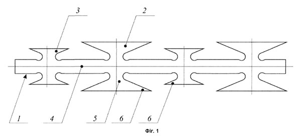Thus, the set of essential features obtained due to the arrangement of additional impressive elements in a wide space between the main destructive elements on the new tier ensures an increase in the stopping properties of the proposed razor tape, and, consequently, the achievement of a solution to the problem. The subsequent essence of the proposed technical solution is explained together with illustrative material, which shows the proposed razor tape without reinforcement of the central section (Fig. 1) and with reinforcement of the central section with elastic wire (Fig. 2).