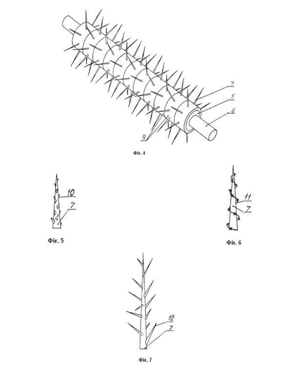 As the embodiment, the shaft 5 can be made fixed, and its outer surface is formed by a cylindrical tube 8, which is freely fitted on the shaft 5 to ensure its rotation in a horizontal plane and onto which the pointed pins 7. The essence of this proposal does not change: tapered pins 7 still remain with respect to the longitudinal axis of the rotary shaft 8 of the pipe 5. Instead the shaft may be worn set of rings 9, which makes independent rotation of the individual tapered pins 7 arranged on one ring 9, from other sharpened pins 7 arranged on the other ring 9.