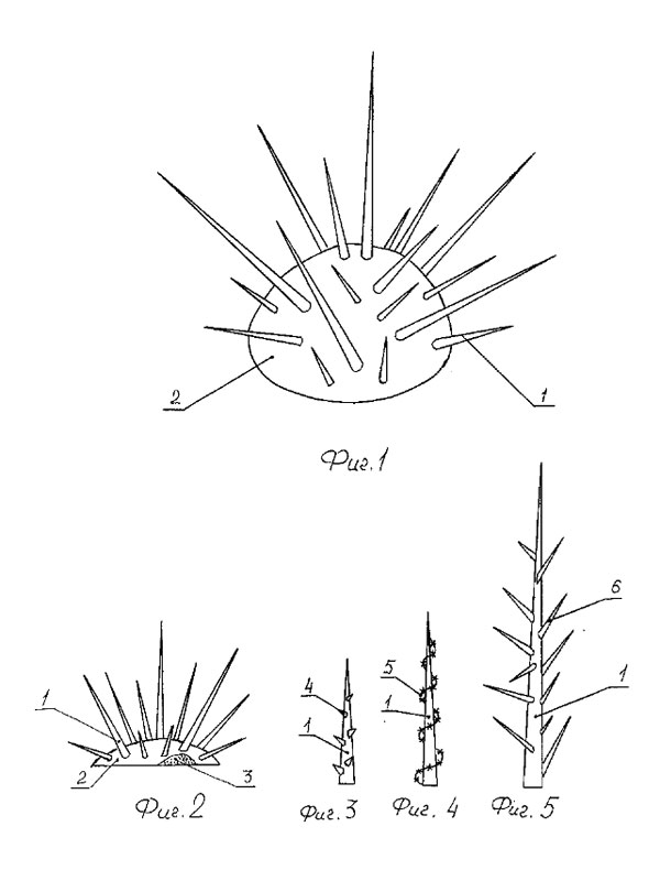 To increase the weight of the substrate, its inner emptiness can be filled by any hard material, for example, is filled with concrete. To enhance the effect of damaging, rigid tapered pins can be provided with additional striking elements in the form set out for them in a chaotic or a symmetrical manner sharpened branches of different lengths, or sharp prongs or barbed tape wrapped.