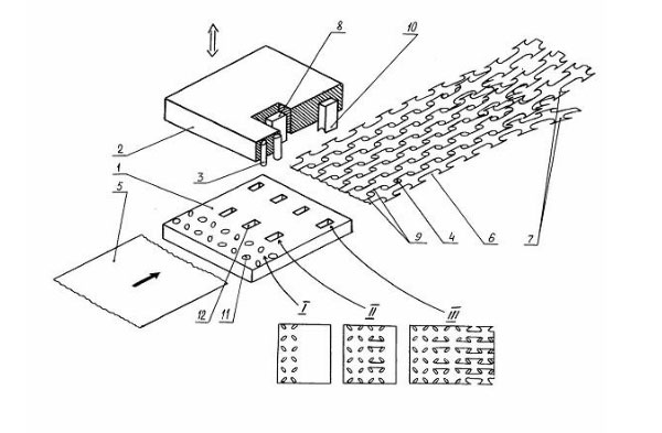 The main disadvantage of this stamp is that the punching operation a significant amount of oval holes and cutting a large number of jumpers carried out simultaneously in one area the width of the model. This, on the one hand, leads to excessive load on the model, which by this excessively deformed or, in general, will have local or metal tears completely severed. Such damage to the integrity of the barbed tapes – is invalid, her marriage. Excessive deformation of ready barbed tapes needs an introduction to the process of mandatory operation of their alignment in the plane for the subsequent dense winding bobbins. On the other hand, a stamp has too complicated structure because it between stamps for punching holes are arranged punches for cutting webs, and all pairs of such complex punches are close distance from one another in one zone for the stamp width. This stamp is quite difficult to make, because then it automatically becomes expensive technological equipment, which in turn is reflected in the worse in the cost of products (barbed tapes). Furthermore, incidental bump (spatial deformation) and several barbed cutting bands in the zone of finding a large number of punches, during penetration of oval holes and fracture of jumpers could lead to jamming of the stamp due to the pushing in its matrix deformed barbed tapes or completely withdraw failure stamp from the broken punches.