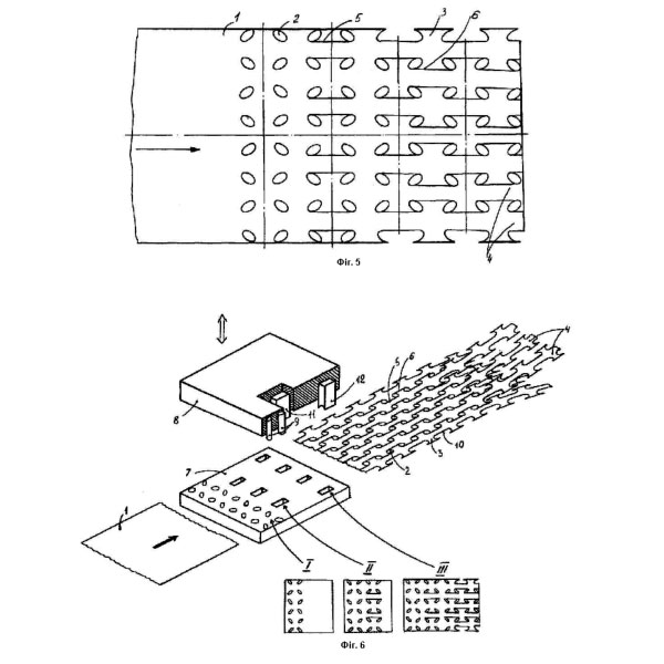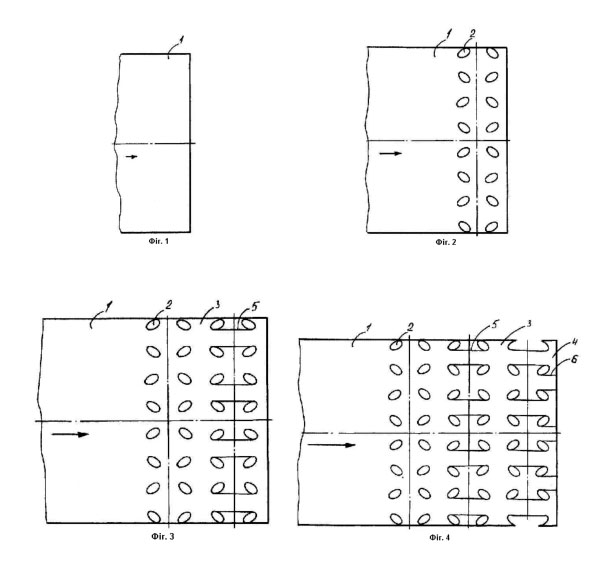 If the initial preform 1 was wider than the total width of multiple barbed tape 4, its width or cut to a certain size (for this stamp may have additional cut-off stamps, which are not shown because well-known), or made of edge portions barbed tape with a few unpaired elements (as in the prototype).