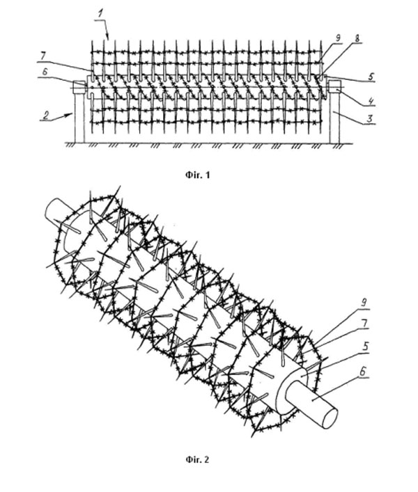 As the fulfilled variant, the shaft 5 can be made fixed, and its outer surface is formed by a cylindrical tube 10, free disposed shaft 5 on which the fixed pins are sharpened 7. The essence of the proposal does not change: sharpened pins 7 and barbed tape 8, and 9 still remain twisted about the longitudinal axis of the shaft 5.