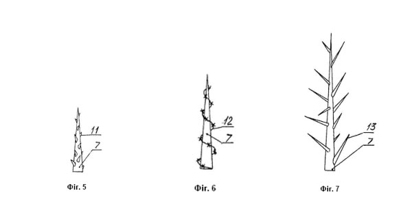 Barbed tape is 8 (wound) in a straight line or in a spiral (it is not shown) to the shaft 5. The same piercing-cutting feed is 9 (wound) in a straight line or in a spiral (it is not shown) and sharpened pins 7.